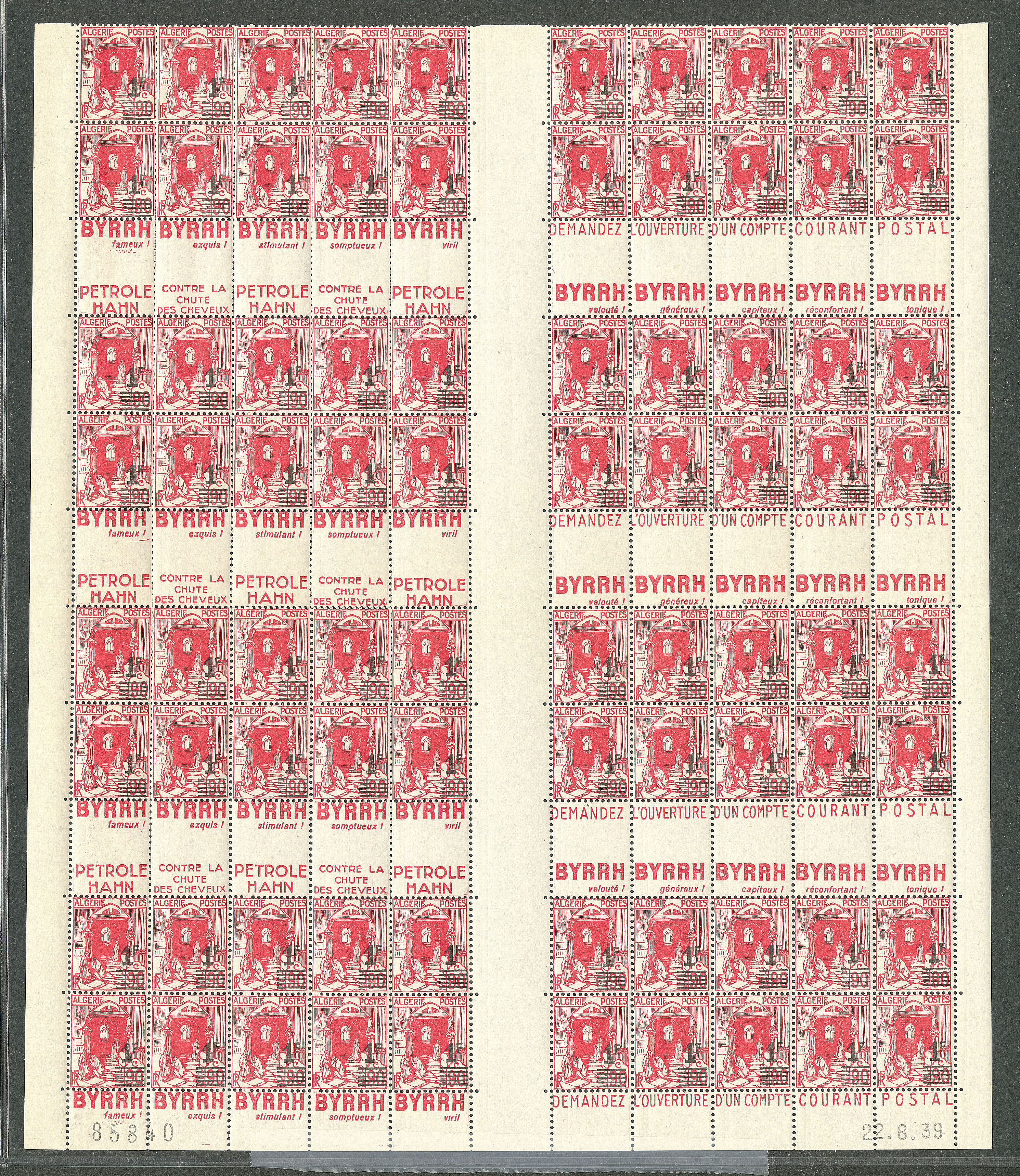 | ** | 1540 | ALGERIE. ** Carnets. No 22a, feuille complète de 80t avec pubs pour la confection de carnets. - TB(N°et cote SM ) | 80 | 4500€ | 650€ | - | |