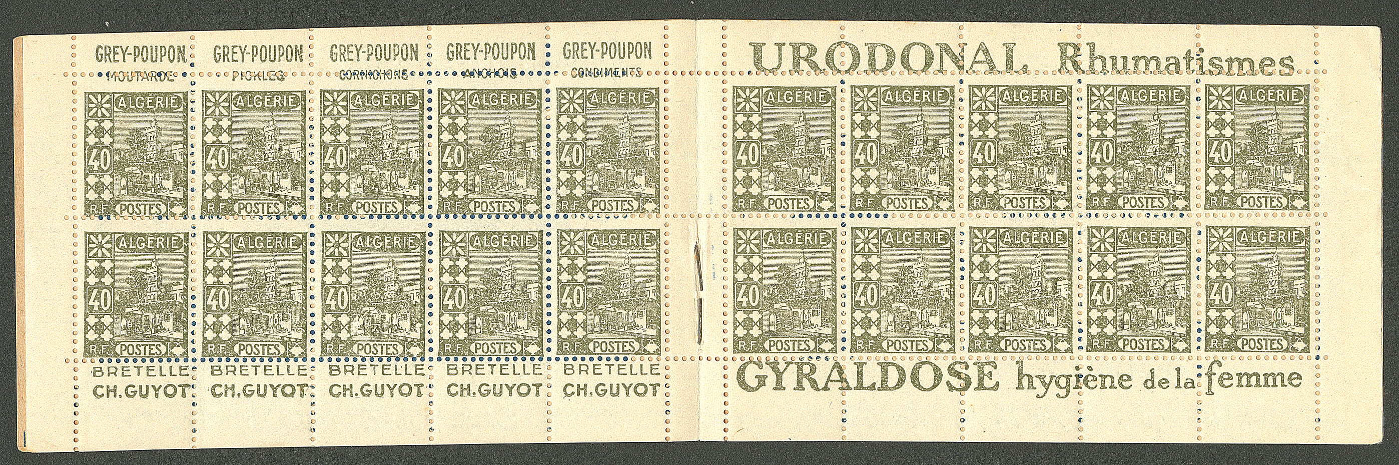 | ** | 1541 | ALGERIE. ** Carnets. No 45-C2 (Yv. C45-5), carnet de 20t #45b, S.119, couv. Nos Loisirs/Guyot, Pub Grey Poupon/Urodonal/Guyot/Gyraldose, traits de plume sur couv. mais TB (cote Yvert) | 400€ | 60€ | - | ||