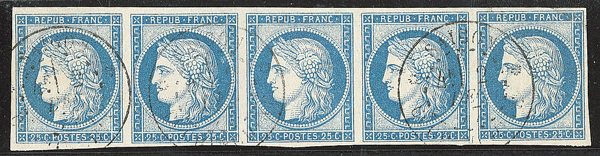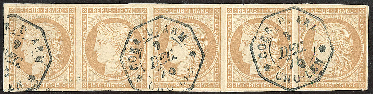 1628 COCHINCHINE.Précurseurs. CG 22, bande de cinq obl cad octog. "Corr.d'Arm Cho-Len" déc 78, un ex pd. - TB 5 - 250€ -