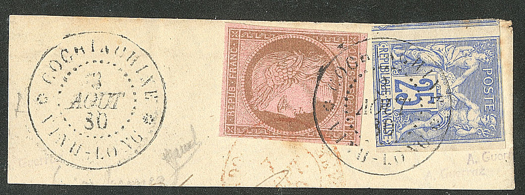 1633 COCHINCHINE.Précurseurs. CG 36 (def) + 18, obl cad "Vinh-Long Cochinchine" août 80, sur petit fragment. - TB 2 - 80€ vendu