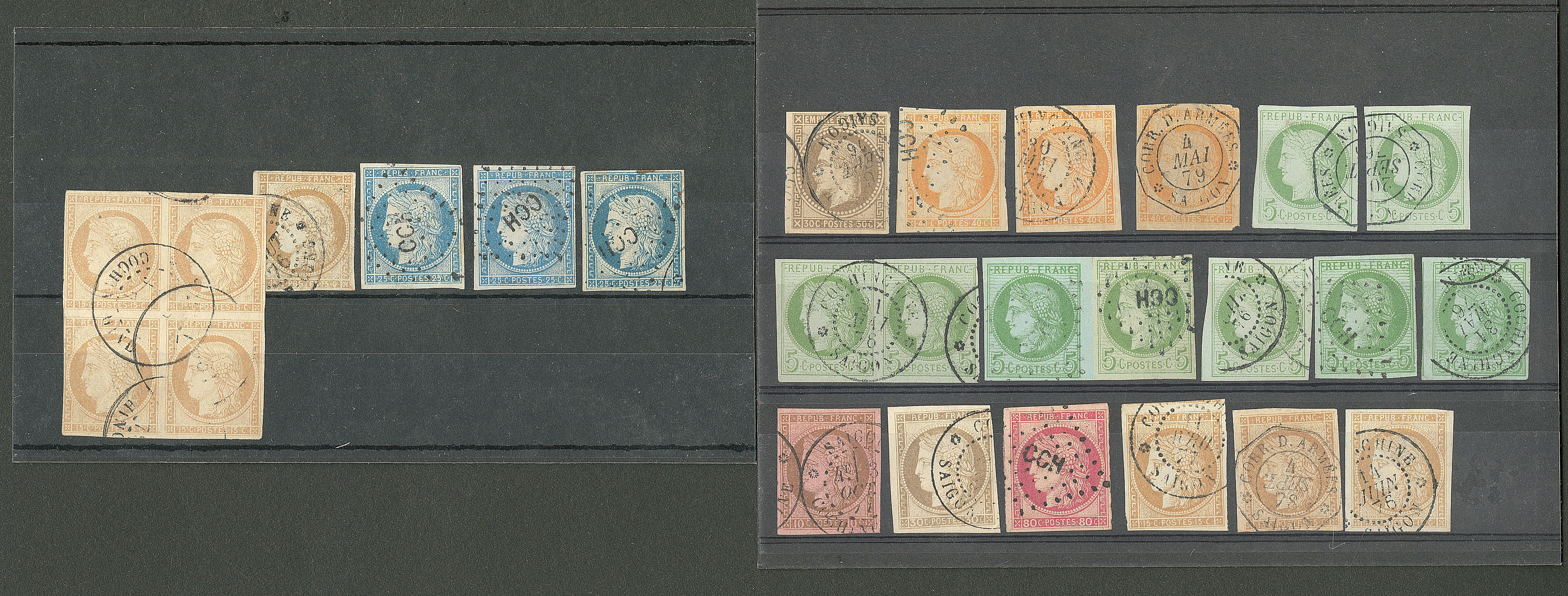 1634 COCHINCHINE.Précurseurs. Lot 1871-1877, cad divers sur timbres entre CG 9 et CG 23, dont Corr. d'Arm. et doubles. - TB, B ou pd 27 - 200€ vendu
