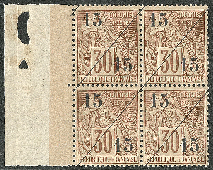 ** 1636 COCHINCHINE. ** No 5, bloc de quatre bdf, infimes adhérences de couleur au verso mais très frais et TB (cote Yvert) 4 1360€ 120€ vendu