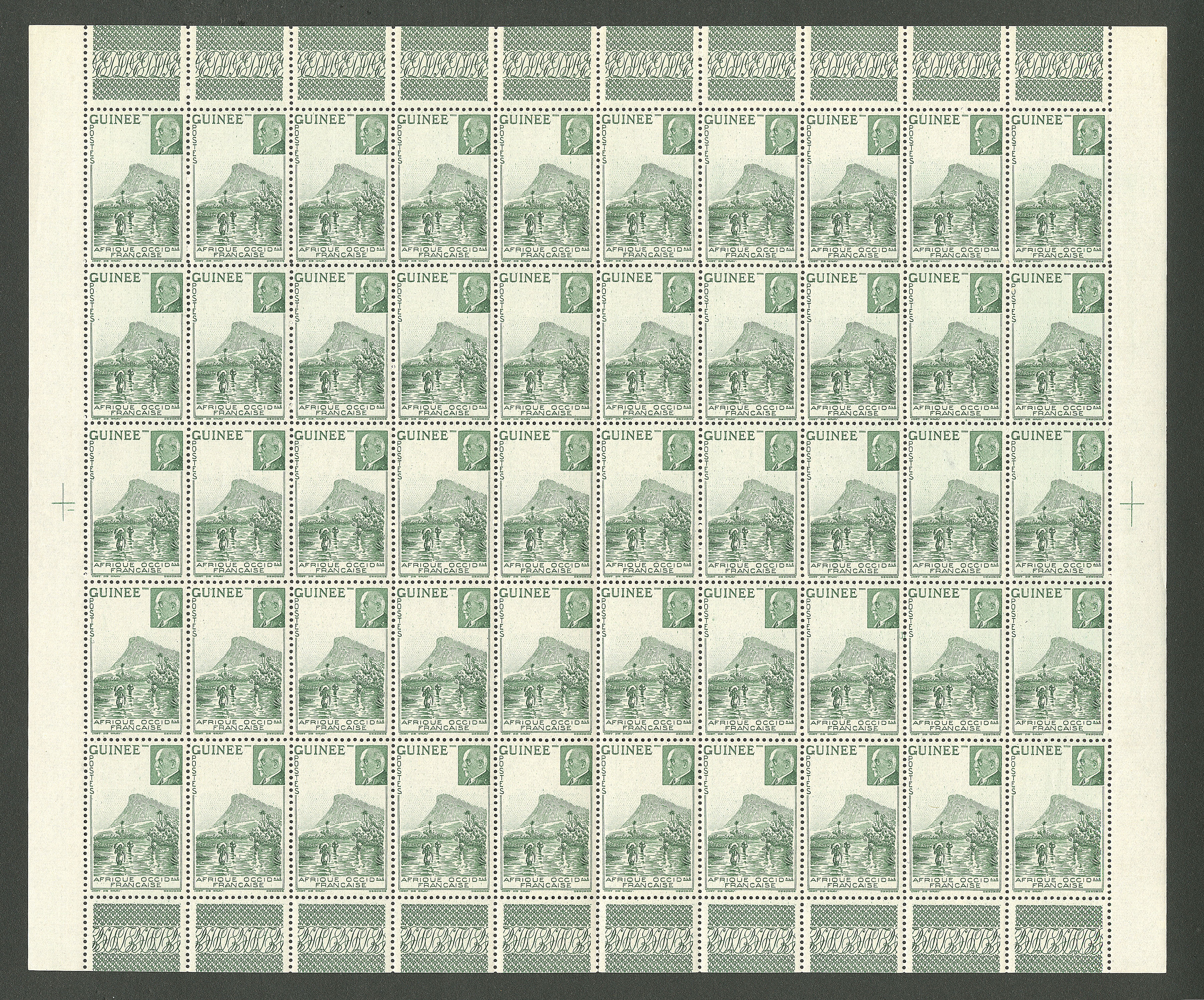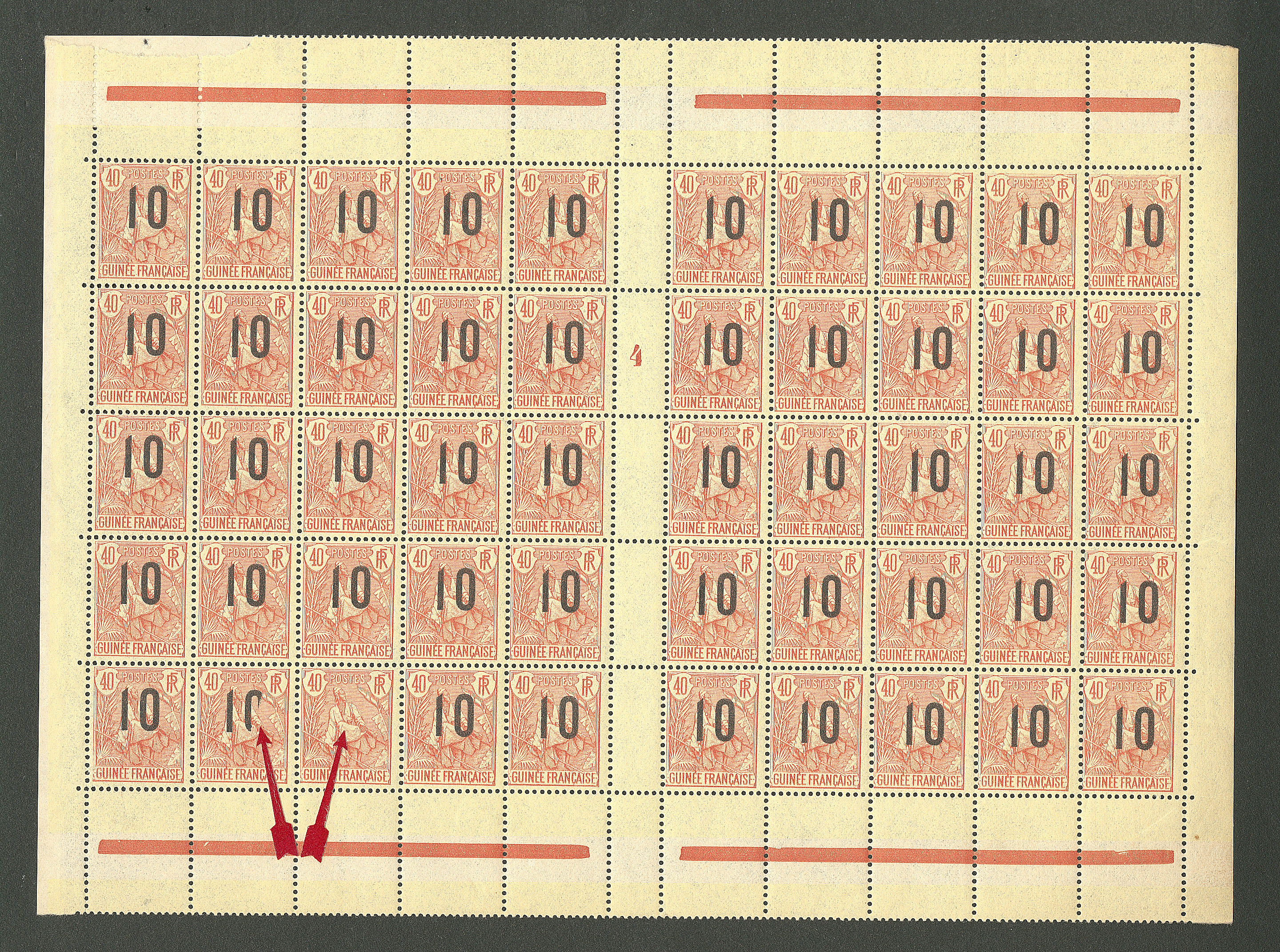 | ** | 1860 | GUINEE FRANÇAISE. ** Sans surcharge. No 61, panneau de 50 ex mill. 4 dont un ex sans surcharge tenant à un ex surcharge partielle, superbe et unique | 25 | - | 1300€ | vendu 4734€ | |