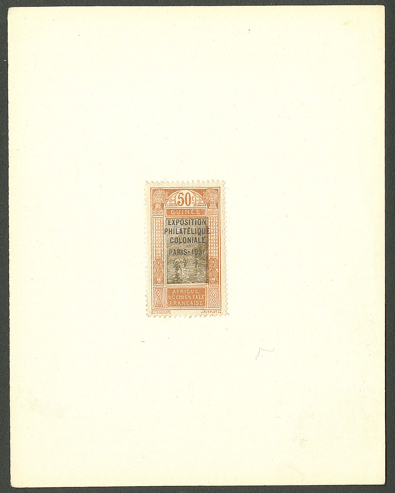 | (*) | 1861 | GUINEE FRANÇAISE. (*) Essai de surcharge pour l'Exposition Coloniale de Paris 1931. No 93 avec surcharge en noir, sur feuillet 142x110mm. - TB. - R | 1 | - | 300€ | vendu 332€ | |