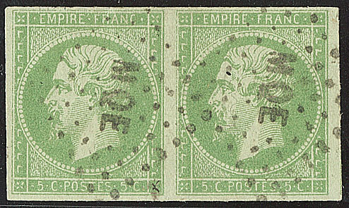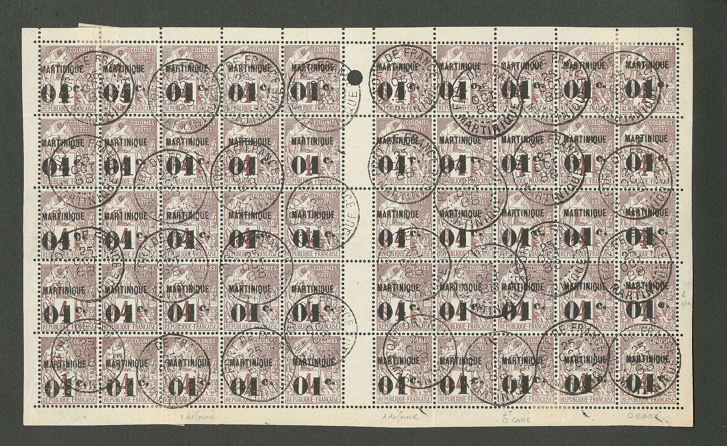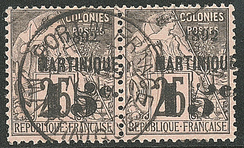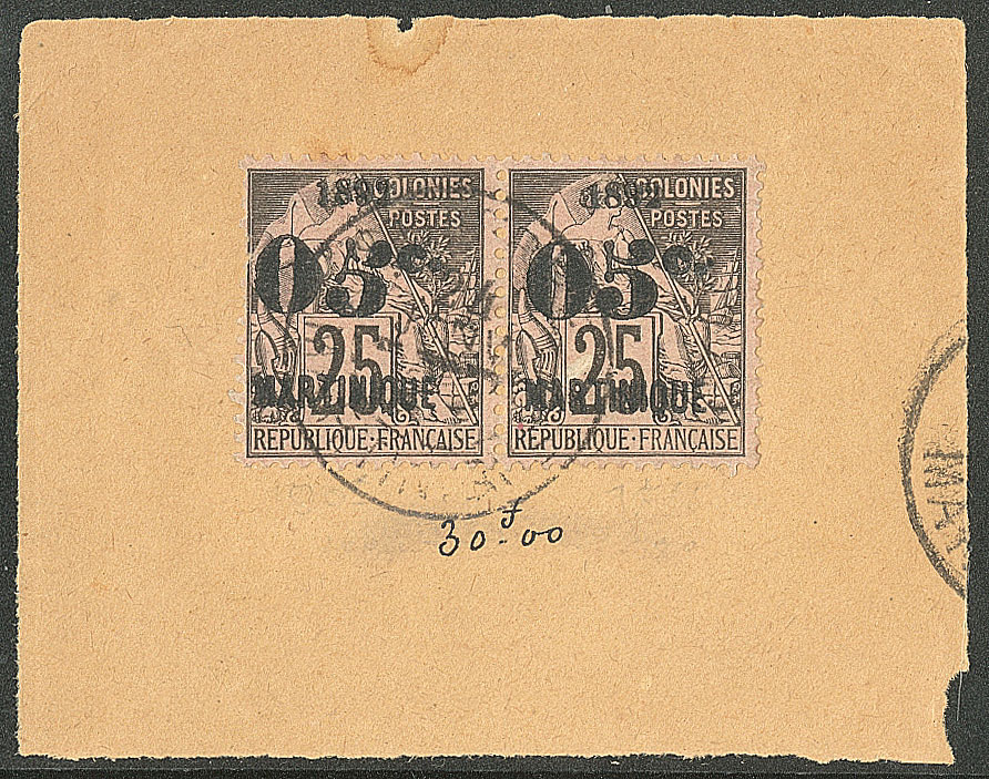 | 1985 | MARTINIQUE."5" penché TAN. No 29aa, paire sur petit fragment, qqs dents courtes. - TB (cote Yvert) | 2 | 480€ | 50€ | - | ||