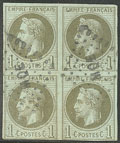 | 1962 | MARTINIQUE.Précurseurs. CG 7, bloc de quatre obl losange "MQE", un ex pd. - TB | 4 | - | 90€ | - | ||