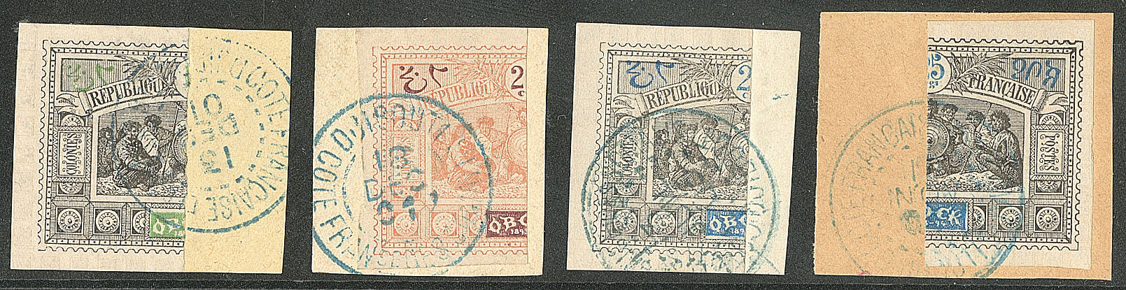 2095 OBOCK.Coupés. Nos 51a, 53a, 54a, 54b, sur 4 fragments. - TB (cote Yvert) 4 192€ 30€ -