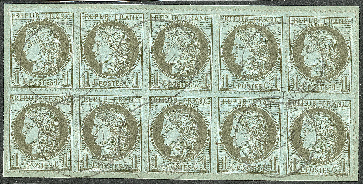 | 483 | CERES 1871-1875.No 50, Vert-olive, bloc de dix obl cad Manzat, sur support. - TB | 10 | - | 250€ | - | ||