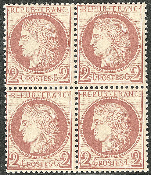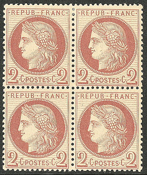 | ** | 485 | CERES 1871-1875. ** No 51, rouge-brun, bloc de quatre (un ex *), très frais. - TB (cote Yvert) | 4 | 950€ | 180€ | - | |