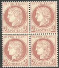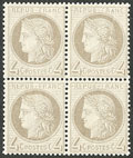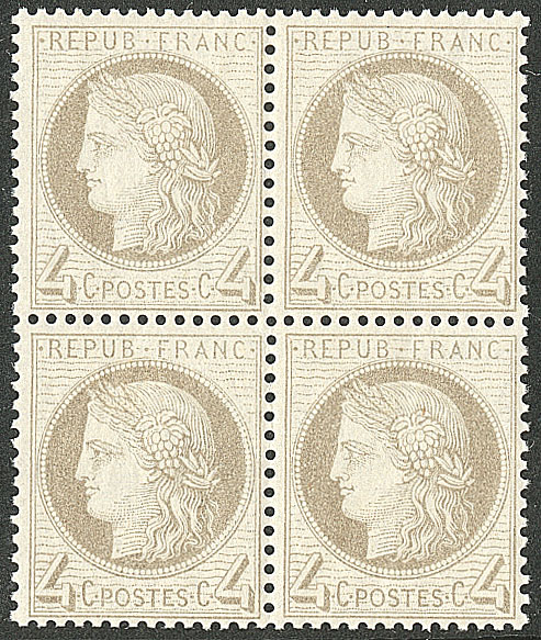 | ** | 530 | CERES 1871-1875. ** No 60C, bloc de quatre (deux ex *), très frais. - TB (cote Yvert) | 4 | 900€ | 120€ | - | |