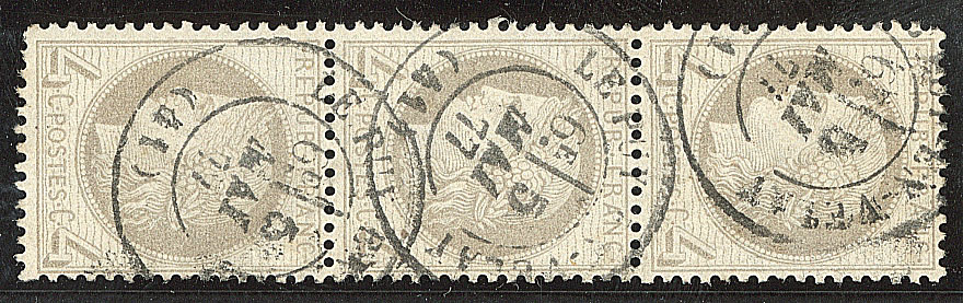 | 491 | CERES 1871-1875.No 52, bande de trois verticale obl cad Le Puy en Velay mai 77, un ex froissure. - TB | 3 | - | 50€ | - | ||