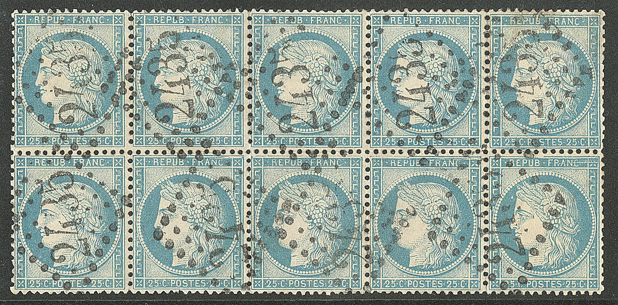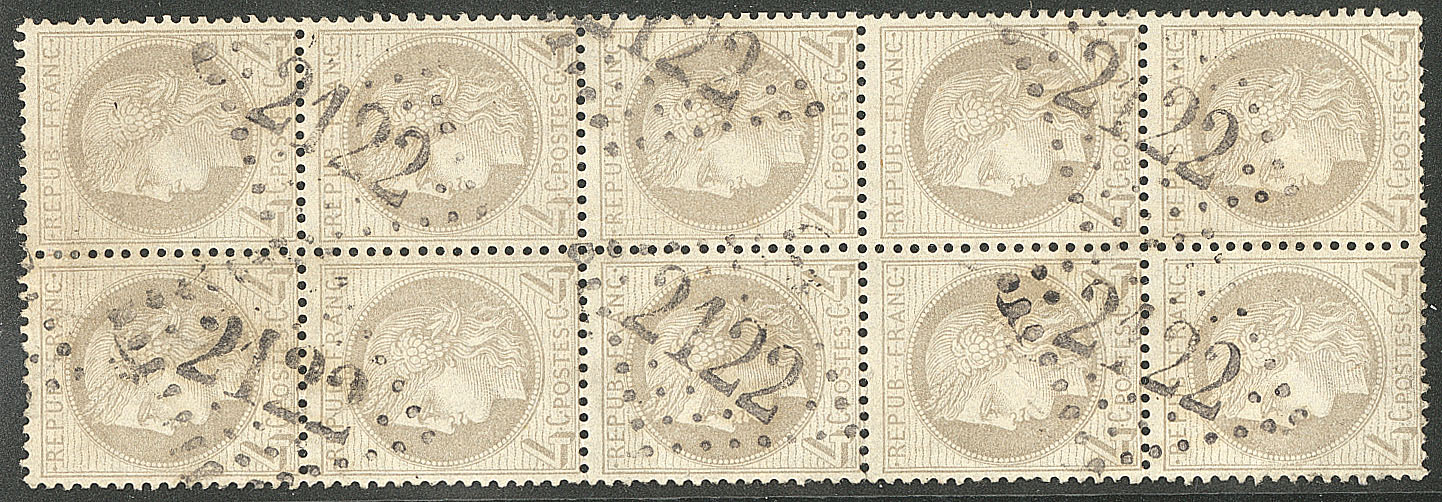 | 526 | CERES 1871-1875.No 60A, bloc de dix (un ex def) obl gc 2435 Montbéliard. - TB | 10 | - | 100€ | vendu 170€ | ||