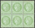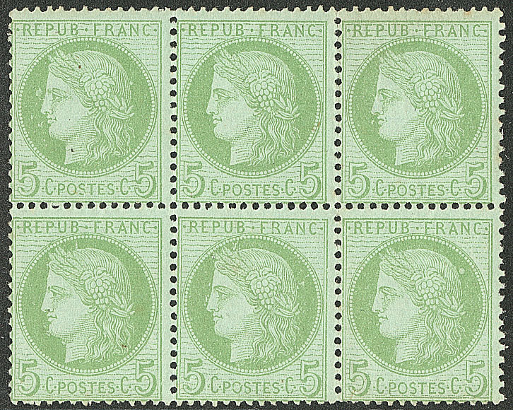 | ** | 497 | CERES 1871-1875. ** No 53, vert-jaune sur azuré, bloc de six (un ex pli d'angle). - TB (cote Yvert) | 6 | 2050€ | 200€ | vendu 234€ | |