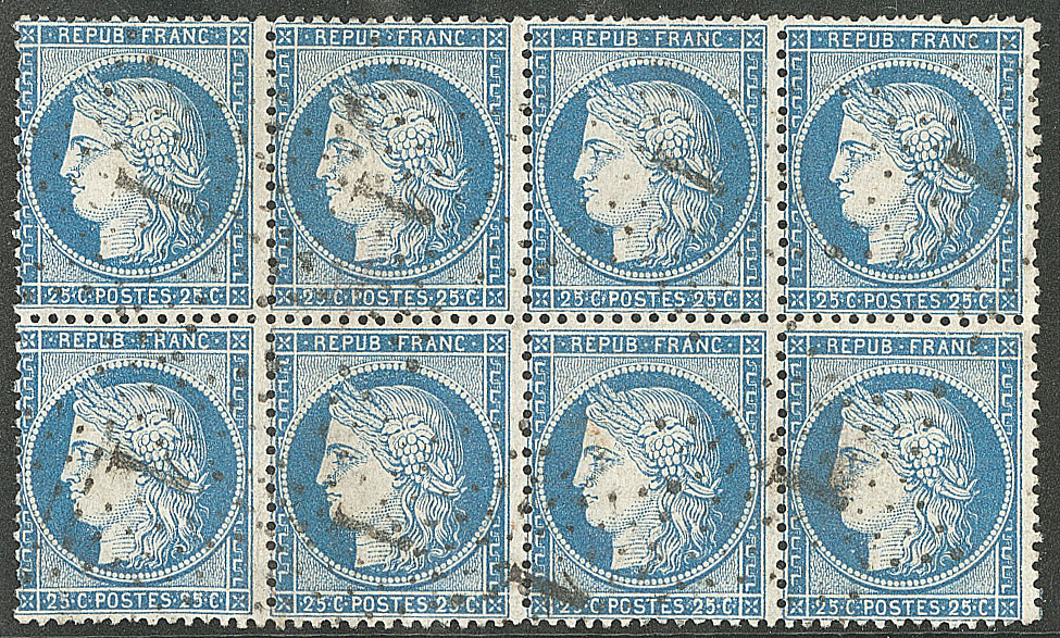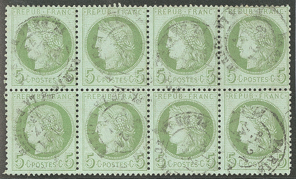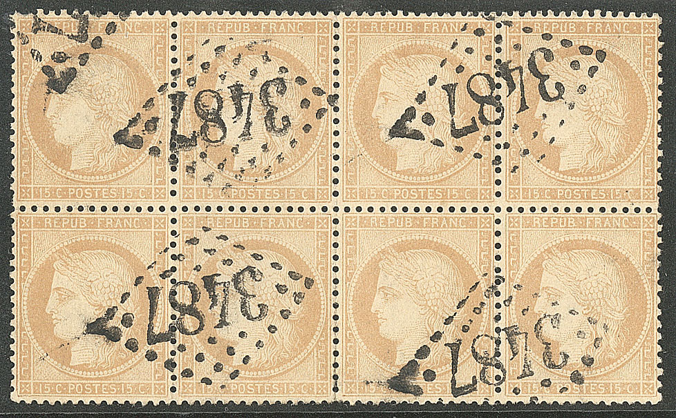 | 525 | CERES 1871-1875.No 60A, bloc de huit obl étoile "1". - TB | 8 | - | 80€ | vendu 107€ | ||
