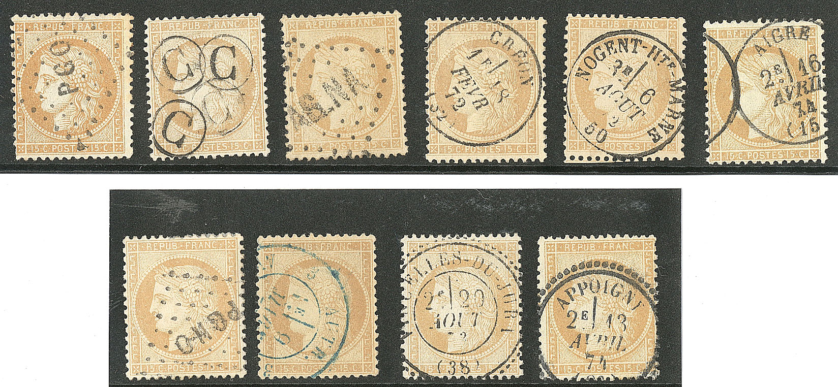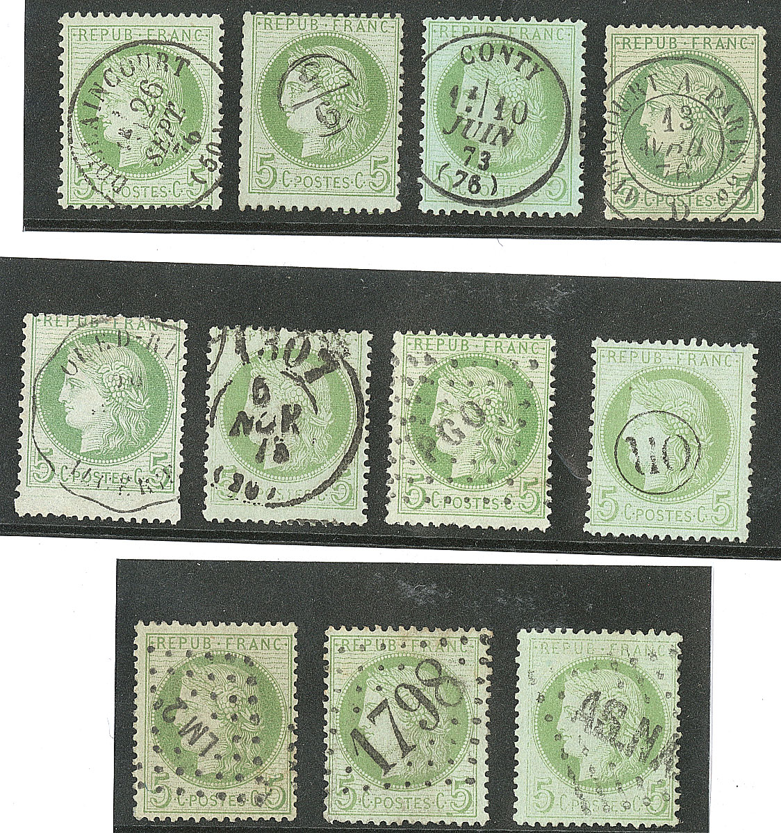 | 501 | CERES 1871-1875.No 53, onze ex obl choisies dont "AS.NA", "OR", etc. - TB | 11 | - | 50€ | vendu 118€ | ||