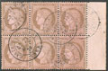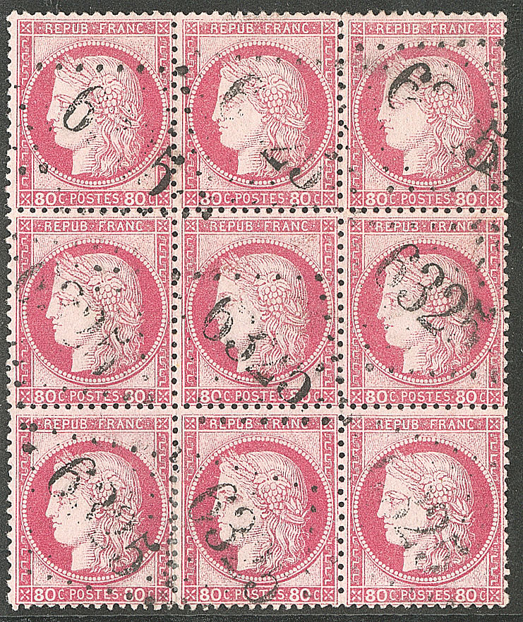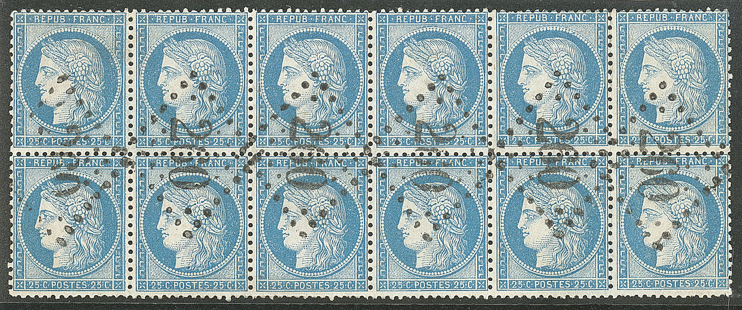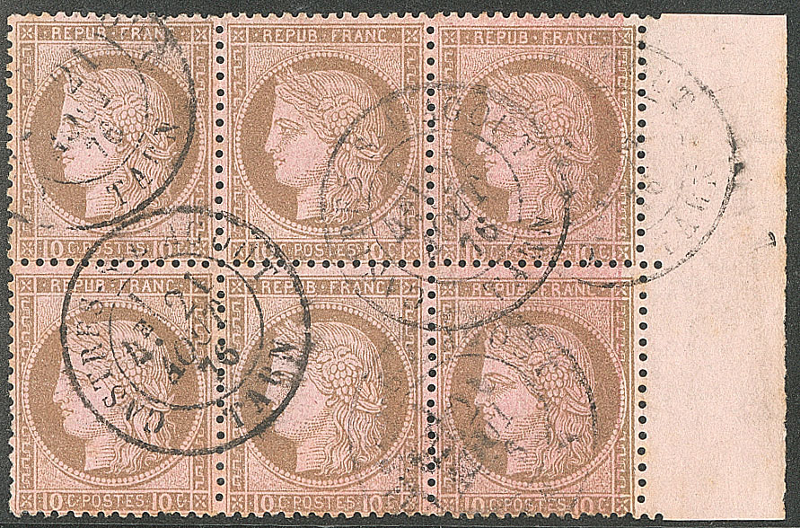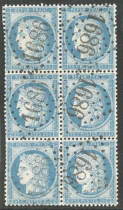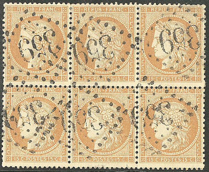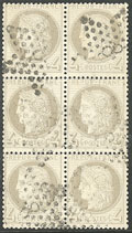 | 520 | CERES 1871-1875.No 59, bloc de six (un ex pd) obl gc 359 de Bayonne. - TB | 6 | - | 100€ | vendu 158€ | ||