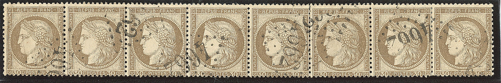 | 509 | CERES 1871-1875.No 56, bande de huit obl gc 4662, 2 ex pd sinon TB | 8 | - | 100€ | - | ||