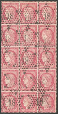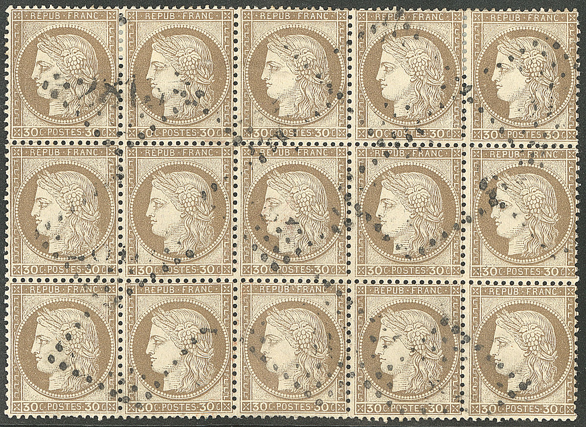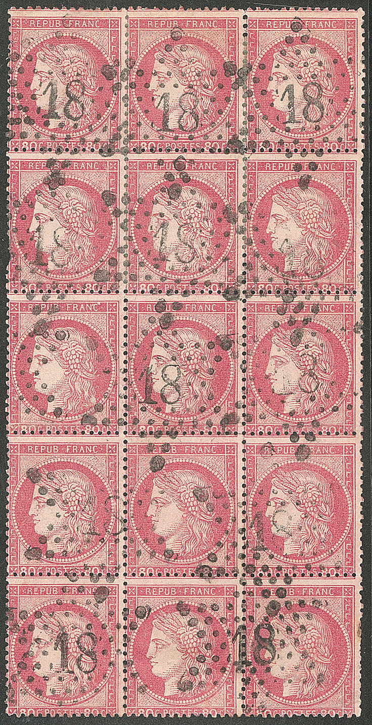 | 515 | CERES 1871-1875.No 57, bloc de quinze (légers défauts) obl étoile "18". - TB | 15 | - | 400€ | vendu 400€ | ||