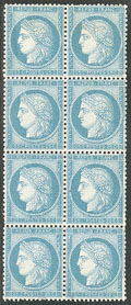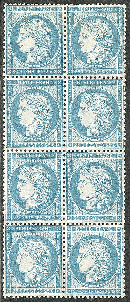 | ** | 524 | CERES 1871-1875. ** No 60A, bloc de huit, planche D3, pos 58-59/68-69/78-79/88-89, la paire du bas amincie, les autres TB | 8 | - | 200€ | vendu 222€ | |