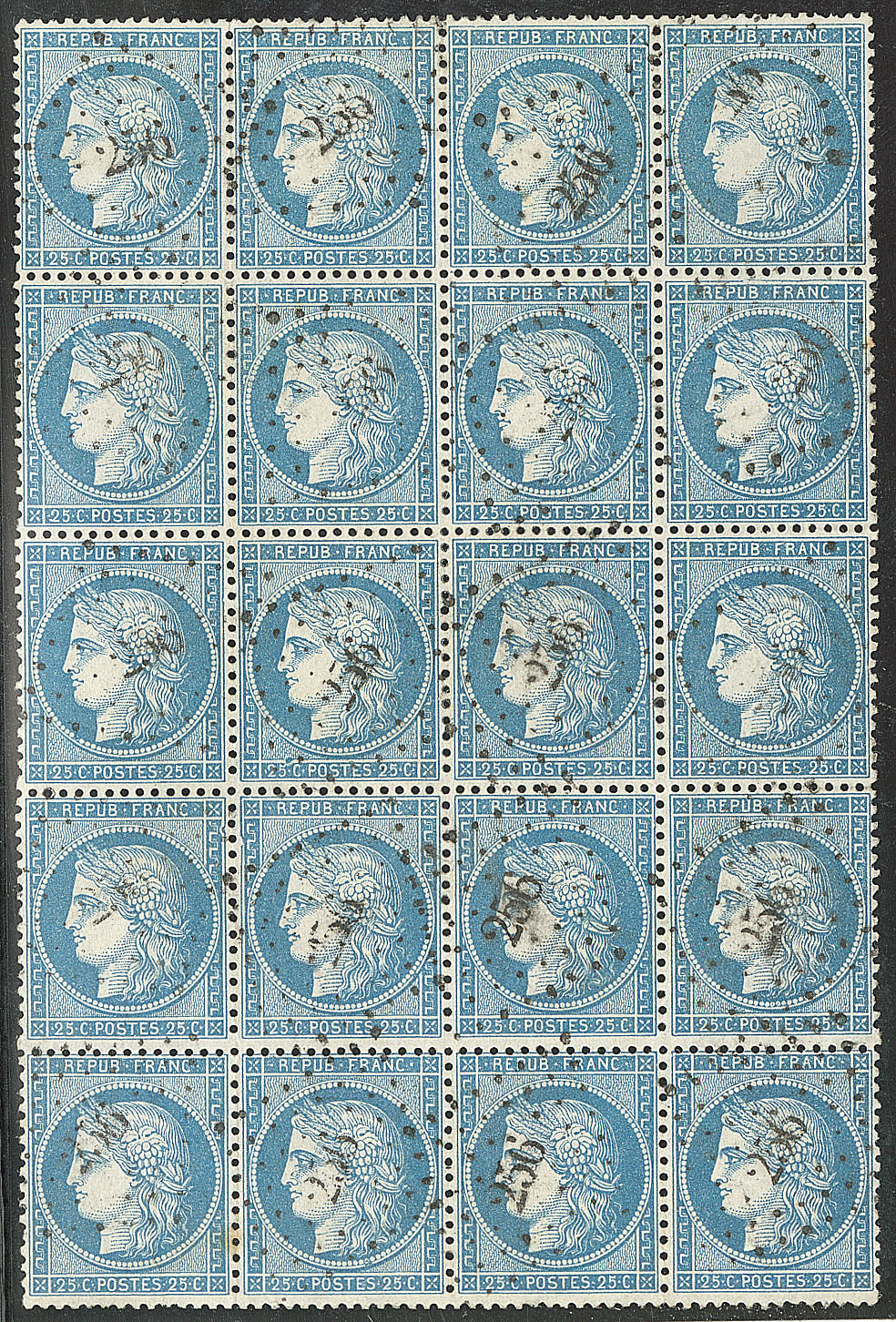 | 528 | CERES 1871-1875.No 60A, bloc de 20 ex (qqs ex pd), obl pgc 256 Avallon, planche B2, pos. 100-103/110-113/120-123/130-133/140-143. - TB | 20 | - | 200€ | vendu 279€ | ||