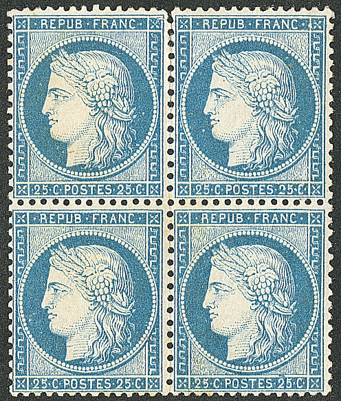 | 532 | CERES 1871-1875.No 60C, bloc de neuf (un ex froissure) obl ancre. - TB | 9 | - | 150€ | - | ||