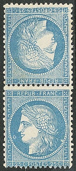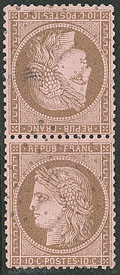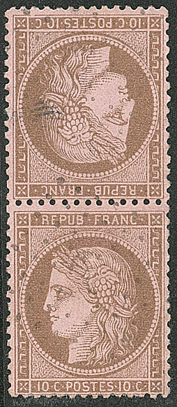 | 534 | CERES 1871-1875.Tête-bêche. No 58c, paire verticale. - TB. - R (cote Yvert) | 2 | 2750€ | 500€ | - | ||