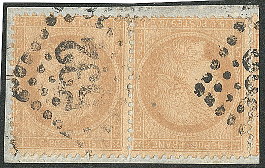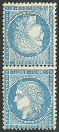 | 535 | CERES 1871-1875.Tête-bêche. No 59b, paire obl gc 532 sur support, jolie pièce. - TB. - RR (cote Yvert) | 2 | 27500€ | 2800€ | - | ||