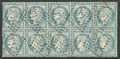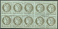 | 494 | CERES 1871-1875.No 52, bloc vertical de dix obl gc 2122, froissures sinon TB | 10 | - | 400€ | vendu 400€ | ||