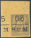 "SAINT-PIERRE-ET-MIQUELON. ** o" et "n" espacés. No 37, case 2, TAN dans une bande de quatre bdf. - TB (Tillard #1892-1c) (cote Yvert)"" |