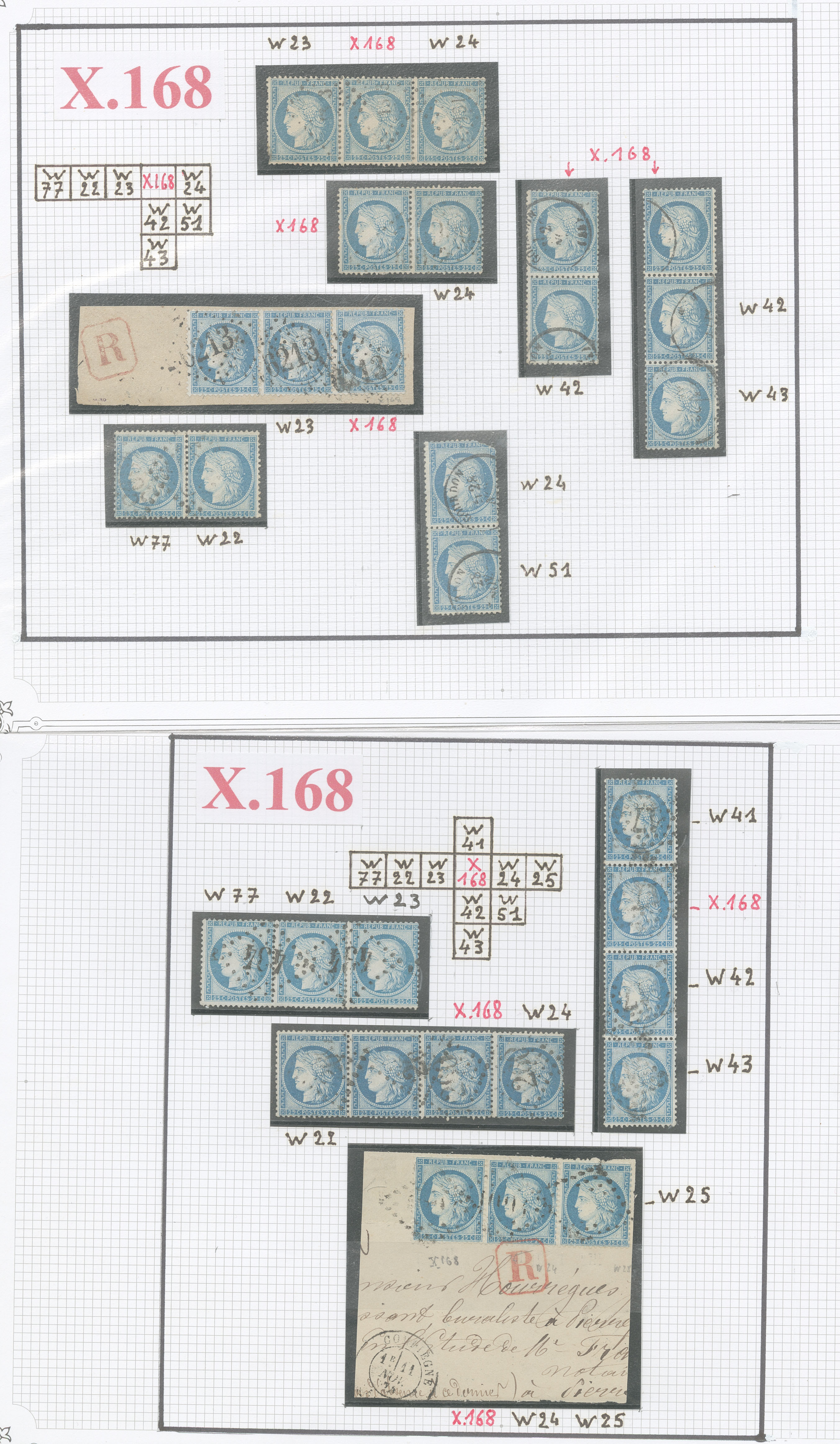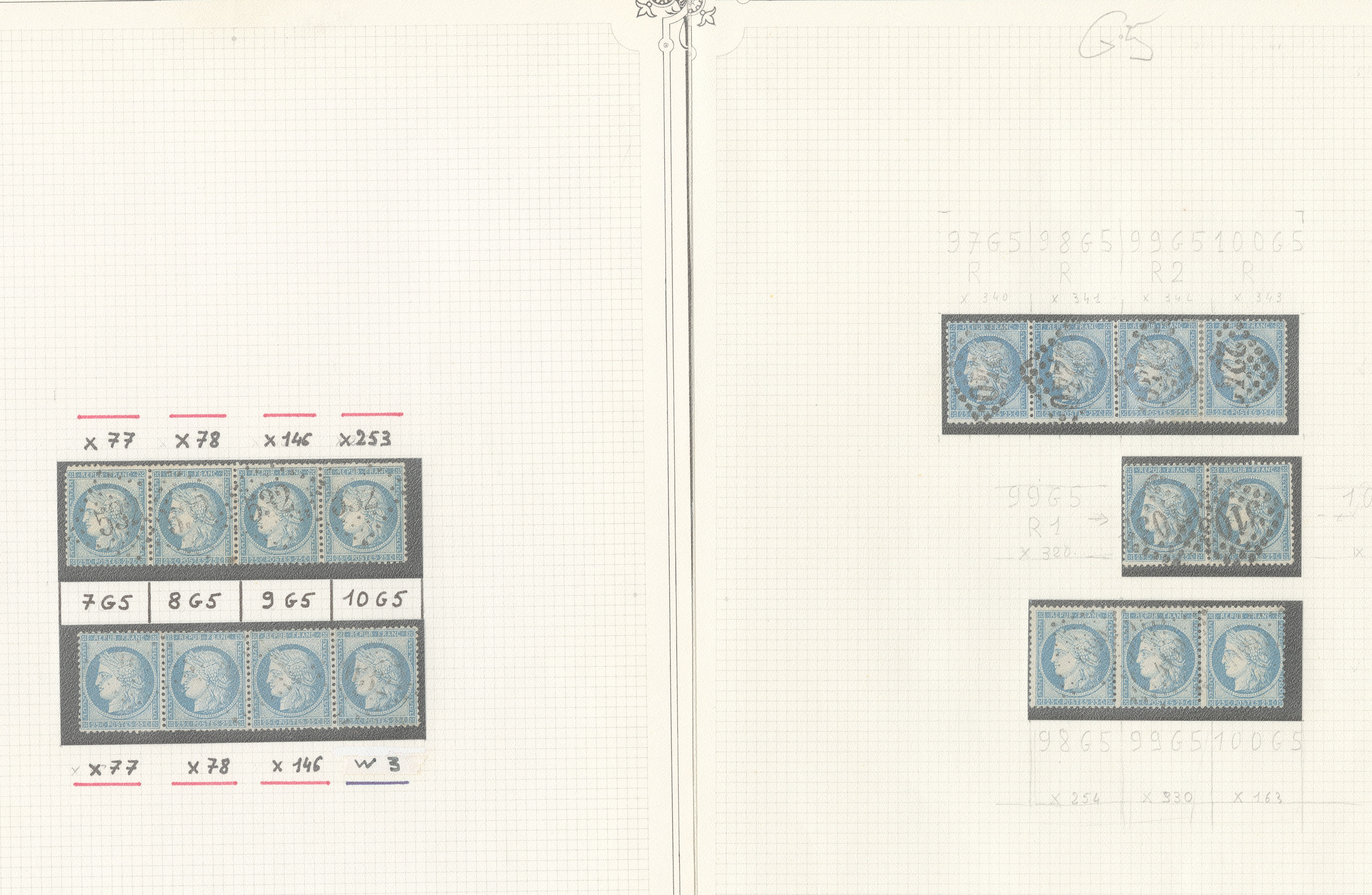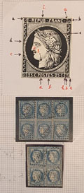 CERES 1871-1875. Lot. Documentations sur les N°60A à 60C, plusieurs milliers de fiches et photos classées concernant les panneaux G1 à D3, G4, D4, G5, D5, en 4 boites métal. - TB (cote Yvert) |