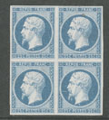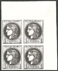 ESSAIS. (*) Projets privés. Lot. 1850-1870, divers Cérès, N.III, Prince Impérial, tous en bloc de quatre, + 2 épreuves bleu et noir et 11 découpures de Projets Renard. - TB (cote Yvert) |