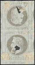 ESSAIS. (*) Empire. 1c mordoré, bloc de quatre, double impression dont une renversée. - TB (cote Yvert) |